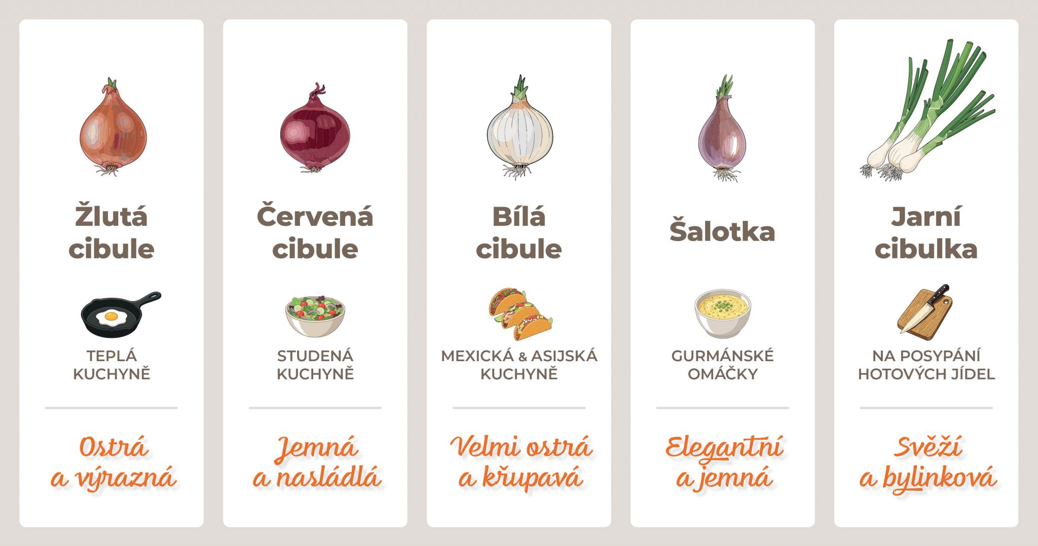 Rozdíl mezi druhy cibule určuje jejich využití v teplé i studené kuchyni: