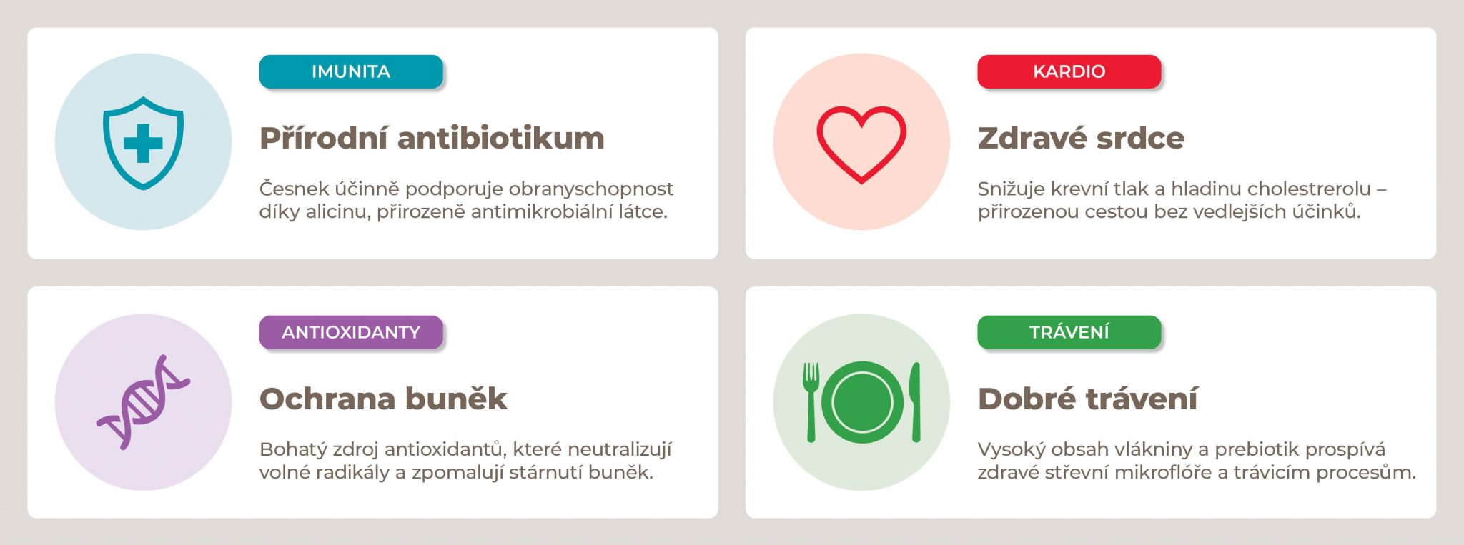- zdravotní benefity česneku zahrnují i podporu srdce a cév.
