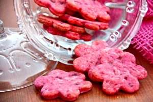 3. Z těsta vyválíme plát silný cca 5mm, vykrojíme stejné nebo i různé tvary a pečeme na 180°C přibližně 10 minut – dorůžova, jako vždy, jen tentokrát opravdu doslova