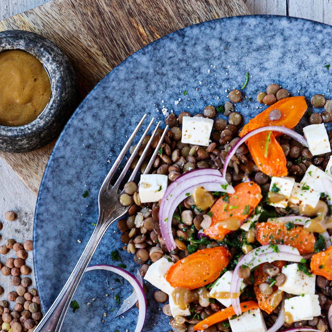 Lehký, sytý a plný chuti a zdravý – to je salát s pečenou mrkví a čočkou je skvělou volbou nejen pro vegetariány. Sladká chuť karamelizované mrkve se krásně doplňuje s jemnou chutí čočky, výraznou hořčicovou zálivkou a slaným balkánským sýrem. Připravte si salát s pečenou karamelizovanou mrkví, čočkou a balkánským sýrem podle receptu od Jakvkuchyni.cz!